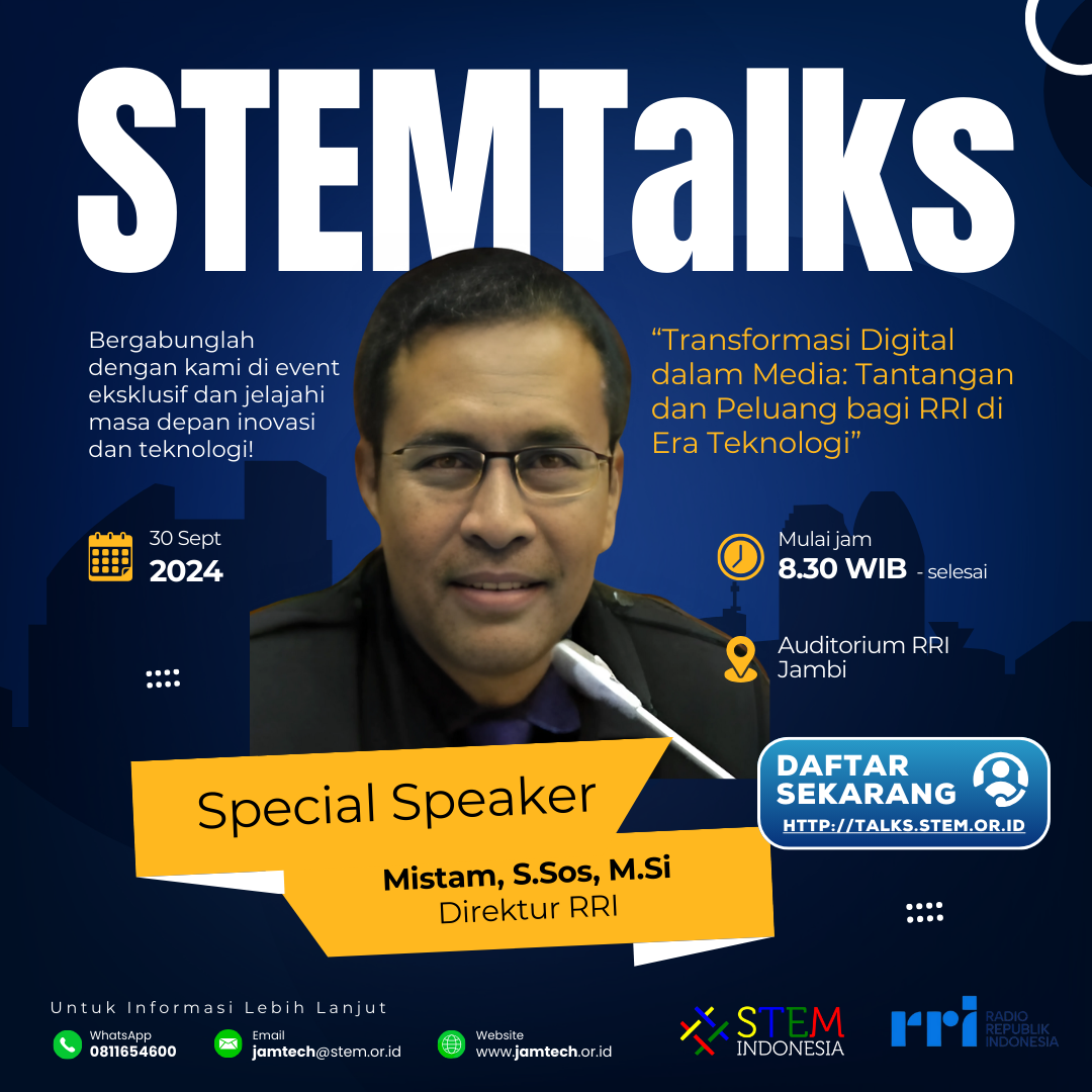Jambi, 30 September 2024 – Dalam acara STEM Talks yang diadakan di Auditorium RRI Jambi, Mistam, S.Sos, M.Si, Direktur RRI, menyampaikan presentasi menarik berjudul “Digital Transformation in Media: Challenges and Opportunities for RRI in the Technological Era.” Acara ini merupakan bagian dari inisiatif STEM Indonesia untuk meningkatkan kesadaran dan pemahaman tentang teknologi di kalangan generasi muda.